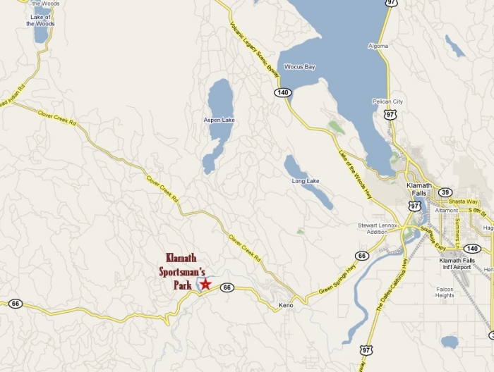 From Klamath Falls: take the Keno/Ashland exit off of 97 and go 14 miles. The Sportsman's Park is just past the 45 mile marker.